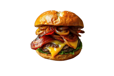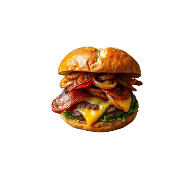 Pain brioché, steak haché, Reblochon, bacon grillé, cheddar, oignon rouge, salade, tomate, sauce au choix