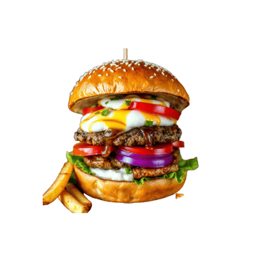 Pain brioché, steak haché, galette de pomme de terre, œuf, cheddar, salade, tomate, , sauce au choix